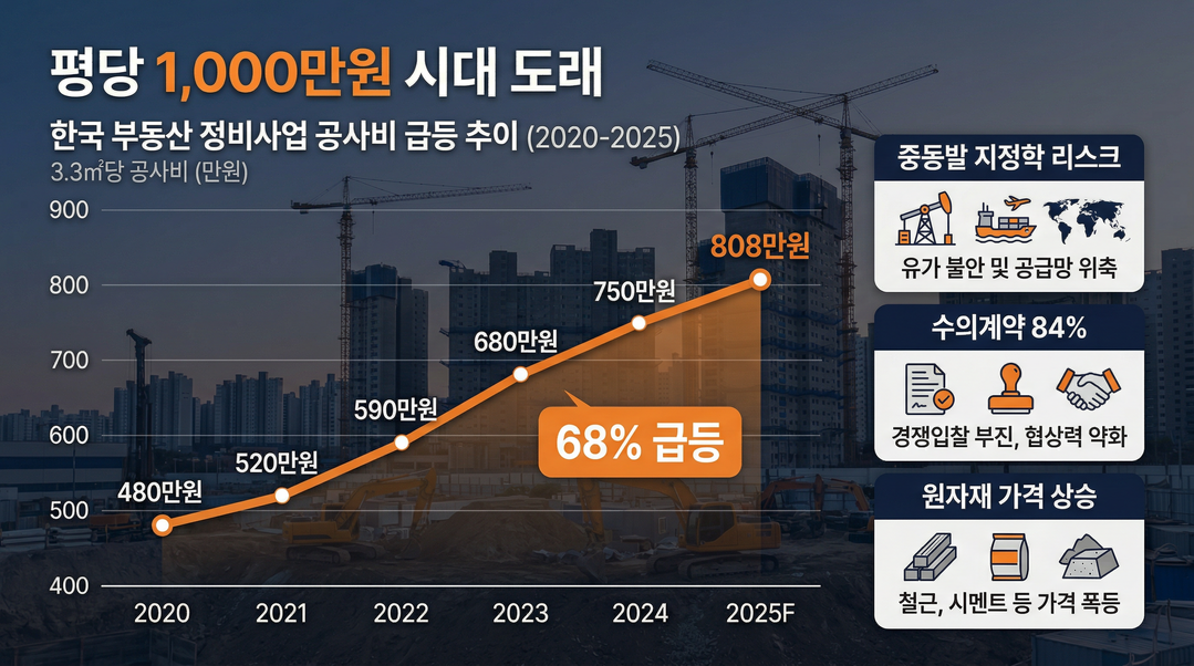 [도시경제채널 = 최강호 기자] 국내 정비사업 평균 공사비가 6년 만에 68% 급등하며 3.3㎡당 808만원을 기록했다. 중동발 지정학 리스크와 수의계약 관행이 맞물리며 공사비 구조가 시장 외부 충격에 취약해지고 있다는 분석이 나온다.