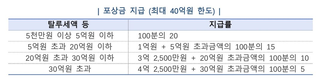 포상금은 중요 자료를 제출한 제보자의 정보를 토대로 세무조사가 개시되고 5000만원 이상의 추징세액이 실제 납부될 때 탈루세액 규모에 따라 최대 40억원까지 지급된다.