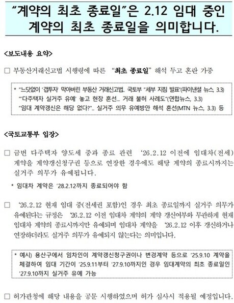 이에따라 국토교통부는 3일 설명자료를 통해 “계약의 최초 종료일은 2월 12일 현재 임대 중인 계약의 최초 종료일을 의미한다”고 명확히 했다. 즉, 2026년 2월 12일 이전에 체결된 임대차 계약은 갱신 여부와 관계없이 해당 계약의 종료 시점까지 실거주 의무가 유예된다는 것이다. 다만 2026년 2월 12일 이후 새로 갱신하거나 연장한 계약은 유예 대상이 아니다.