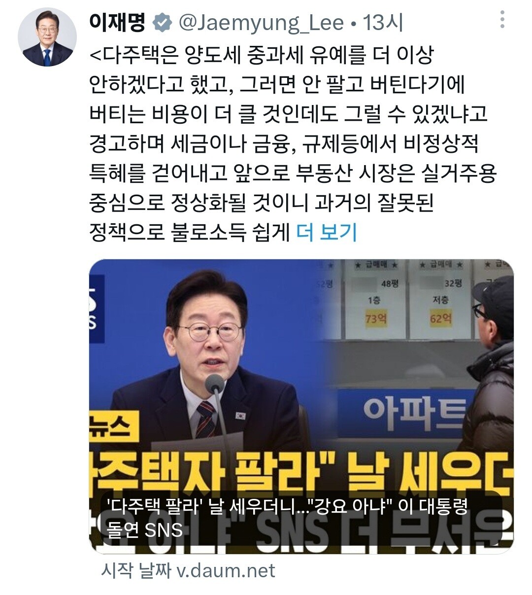 이 대통령은 같은 날 저녁 추가 글을 통해 “다주택 유지가 손해가 될 것임을 엄중히 경고했으니 매각 권고 효과는 당연히 있다”며 “직설적 요구는 반감을 사기 때문에 이익이 되는 상황을 만들고 이를 알려 매각을 유도했을 뿐”이라고 설명했다.