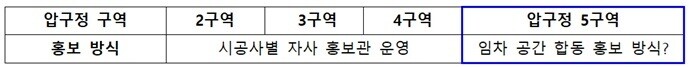 유독 5구역에서만 이러한 '압구정 스탠다드'를 무시하고 현대건설을 비롯한 일부 건설사들이 '합동 홍보공간 운영'을 주장하는 것은, 경쟁사가 준비한 고퀄리티 홍보·제시안과 현대건설의 제안이 비교되는 것을 사전에 차단하고, ’기울어진 운동장‘ 분위기를 조성하여 발을 빼게 만듦으로서 수의계약 수순을 밟으려는 의도로 풀이된다.