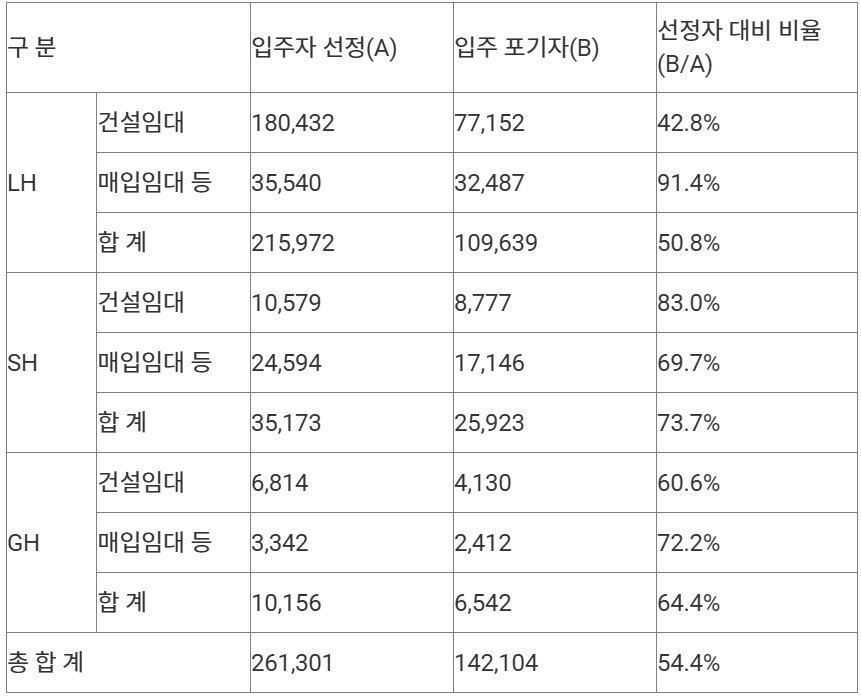 입주 포기자 비율은 LH가 50.8%, SH 73.7%, GH는 64.4%로 사업자 3곳 모두 절반을 웃돌았다.