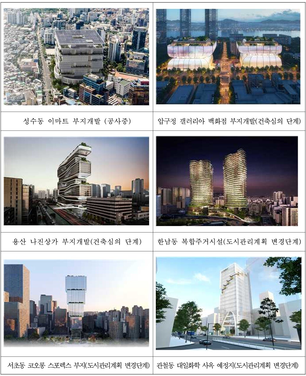 성수동 이마트 부지에서는 이미 공사가 진행 중이며, 압구정동 갤러리아백화점 부지와 용산 나진상가 부지 등 4곳은 건축위원회 심의를 앞두고 있다.