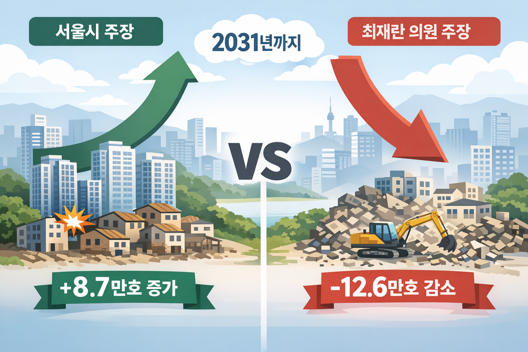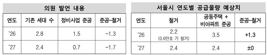 반면 최 의원은 본회의 발언에서 “22만 1000호가 철거되고 같은 기간 9만 5000호만 준공돼 오히려 12만 6000호가 줄어든다”고 주장했다. 서울시는 이 수치가 ‘연도별 준공-철거 물량’을 기준으로 한 것으로, 정비사업 전체의 순증 효과와는 전혀 다른 개념이라고 반박했다.