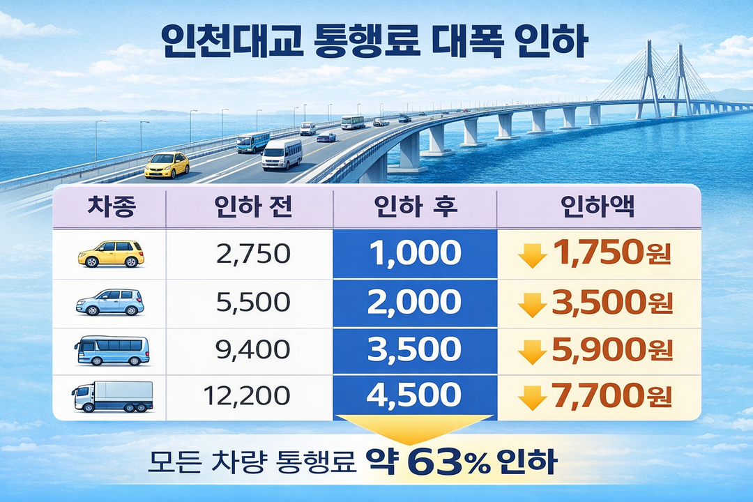 영종대교는 통행료 인하 이후 하루 약 13만 대가 이용하며 2023년 10월부터 2025년 11월까지 약 3,200억 원의 통행료 절감 효과가 발생한 것으로 나타났다. 이번 인천대교 요금 인하 역시 이용자 부담을 크게 줄일 전망이다.