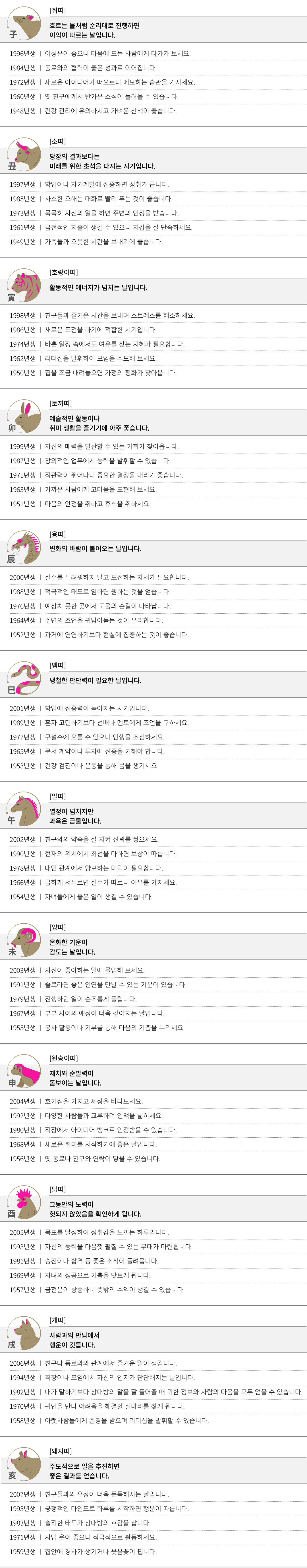 정해 (丁亥) 오늘의 띠별 운세
