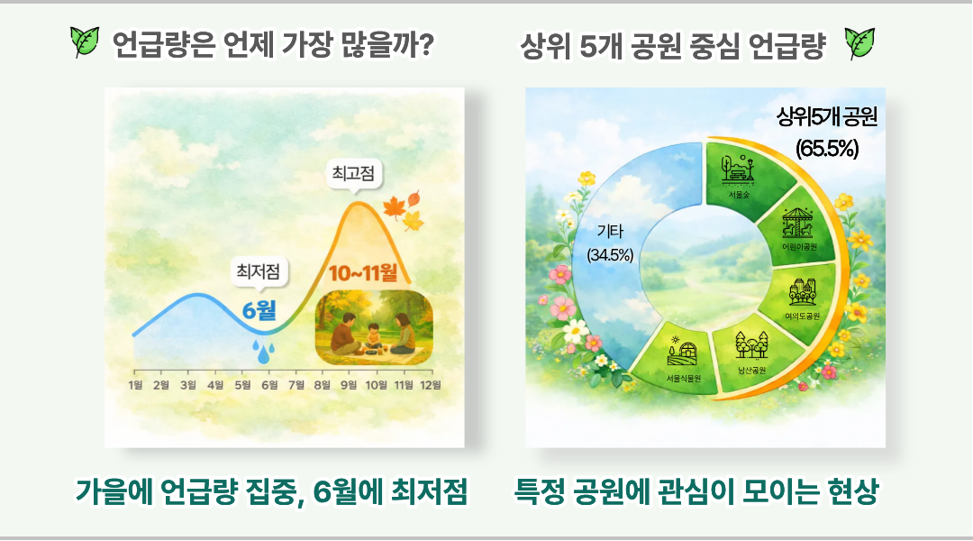 특히 서울숲은 ‘구경, 맛집, 저녁, 느낌, 마음’ 등 일상과 정서적 키워드가 두드러졌고, 여의도공원은 ‘대회, 참여, 현장’ 등 행사 관련 언급이 많았다.