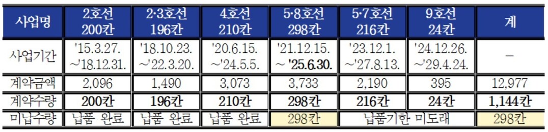 특히 5·8호선 전동차 298칸 미납품으로만 105억 원에 달하는 비용이 발생했으며, 납품 지연이 계속될 경우 노후차량 정비비는 더 늘어날 수 있다.