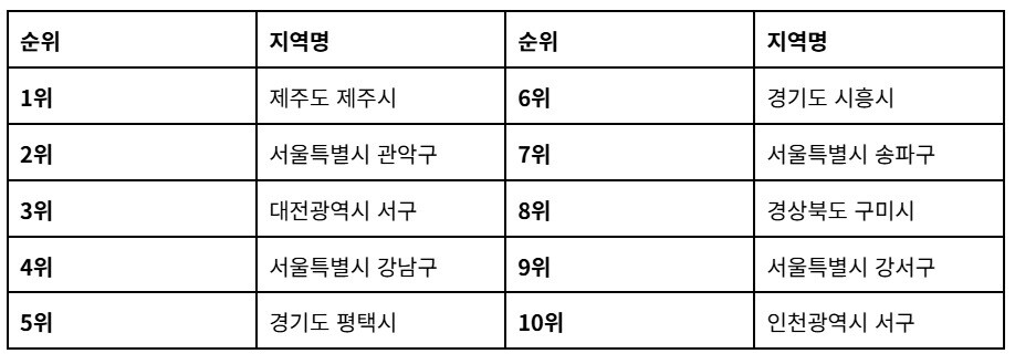 산업 단지를 배후에 둔 도시들의 성장도 눈에 띄었다. 경기 평택시(5위)를 비롯해 경기 시흥시(6위), 경북 구미시(8위)가 10위권에 이름을 올렸다. 산업단지 인근으로 이주한 근로자들이 직주근접을 위해 동네 매물을 탐색한 결과로 해석된다. 해당 지역들의 거래 완료 게시글 수는 24년 대비 평균 3배 이상 증가한 것으로 나타났다. 이 밖에 서울 송파구(7위)와 강서구(9위), 인천 서구(10위)가 상위권에 포함됐다.