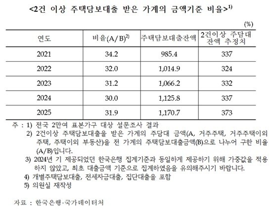 8일 조국혁신당 차규근 의원이 국가데이터처와 한국은행으로부터 제출받은 자료에 따르면, 전체 주택담보대출 잔액 중 2건 이상 대출을 보유한 다주택자의 비율은 2021년 34.2%에서 2024년 30%까지 줄었으나, 2025년 다시 31.9%로 증가세를 보였다. 같은 기간 잔액 규모도 2024년 337조원에서 2025년 373조원으로 약 36조원 늘어난 것으로 확인됐다.