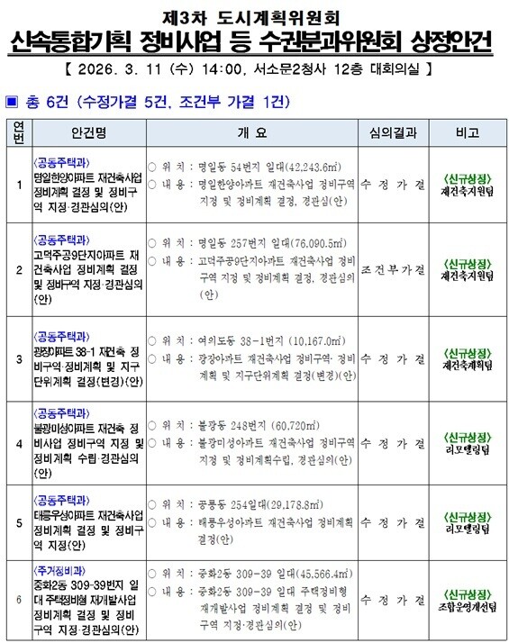 [도시경제채널 = 김학영 기자] 서울 강동권과 여의도, 강북의 주요 노후 아파트 단지들이 대거 재건축 심의 문턱을 넘으며 정비사업에 속도가 붙을 전망이다. 서울시는 11일 제3차 도시계획위원회 신속통합기획 정비사업 등 수권분과위원회를 열고, 명일한양아파트 등 상정된 정비계획안 6건을 모두 가결 처리했다고 12일 밝혔다.