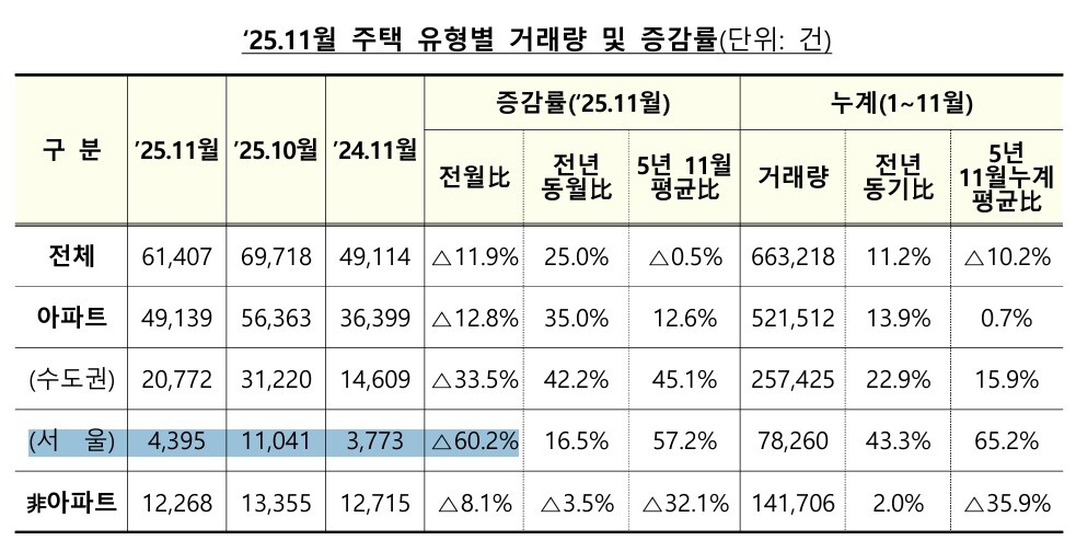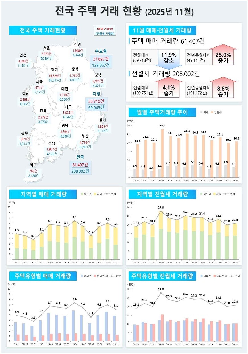 31일 국토교통부에 따르면 11월 전국의 주택 매매 거래량(신고일 기준)은 총 6만1천407건으로, 전월(6만9천718건) 대비 11.9% 감소했다.