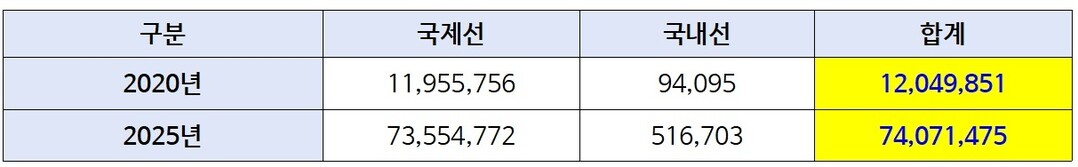 연간 이용객은 코로나19 저점이던 2020년 1,200만 명에서 2025년 7,400만 명으로 6배 이상 급증했다. 그러나 보안검색 인력은 같은 기간 1,928명에서 2,043명으로 5% 증가에 그쳐 수요 증가를 따라가지 못했다. 국민신문고 민원도 2020년 631건에서 2024년 2,541건으로 4배 늘어나 서비스 체감도 악화가 수치로 확인됐다.