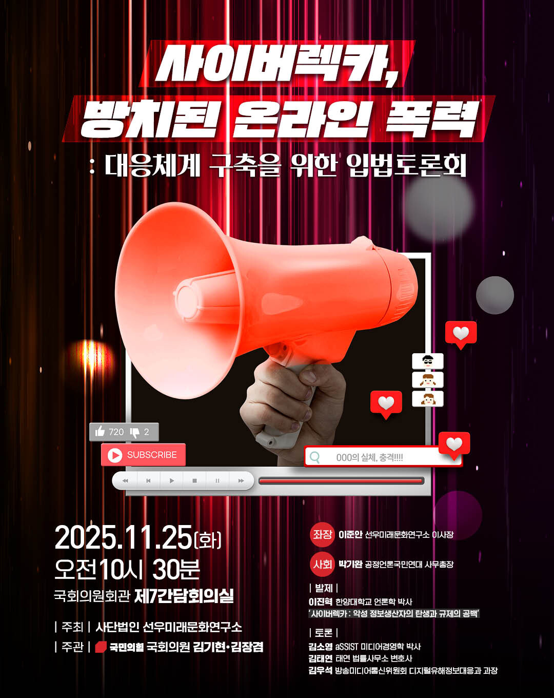 토론회에서는 사이버렉카가 조회수와 광고수익을 위해 검증되지 않은 가십과 허위·조작 정보를 양산하고, 악성 댓글과 ‘좌표 찍기’ 등 조직적 온라인 폭력이 반복되는 현실이 집중 진단된다.