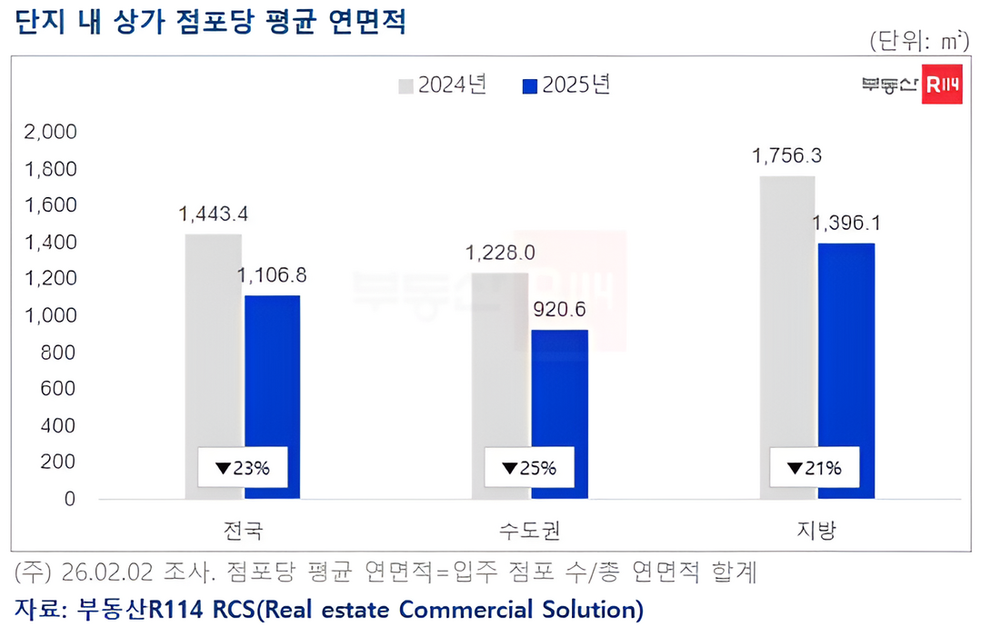 R114는 "상가 공급 규모를 최소화하는 추세가 강화되는 가운데, 소자본으로 운영할 수 있는 소규모·실속형 점포에 대한 임차 수요가 확대되면서 단지 내 상가 내부 점포 구성이 점차 소형·고밀화하고 있다"고 진단했다.