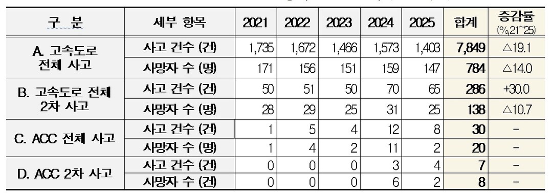 최근 2년 사이 ACC 작동 중 발생한 2차 사고가 급증했다. 2024년에는 3건(사망 6명), 2025년에는 4건(사망 2명)이 발생했으며, 치사율은 무려 114.3%로 일반 사고 대비 11.4배에 달했다. 이는 ACC 기능을 과신한 운전이 치명적인 결과로 이어질 수 있음을 보여준다.