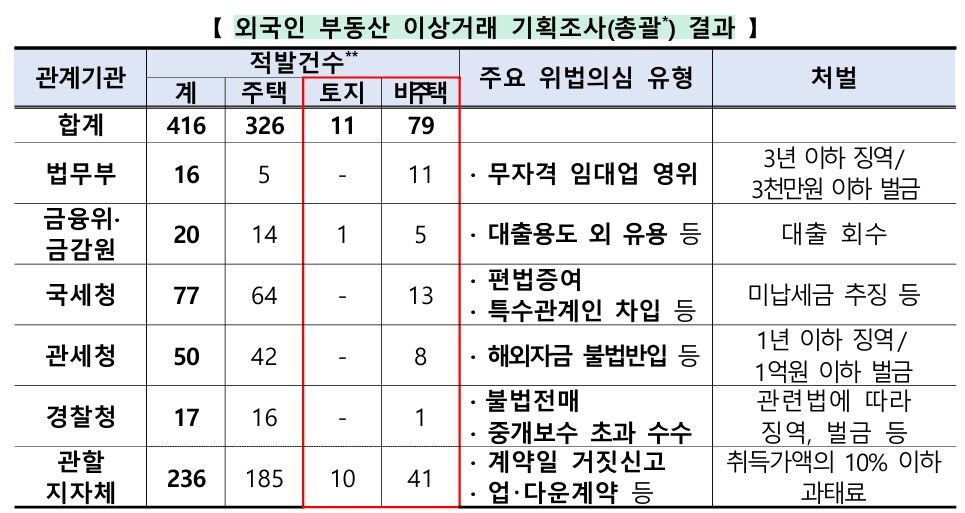 단기 체류 외국인이 서울 오피스텔을 매수한 뒤 임대보증금 1억 2천만 원 규모의 월세 계약을 체결해 임대수익을 얻은 사례가 적발됐다. 체류자격 외 활동허가 없이 임대업을 영위한 것으로 법무부에 통보됐다. 이외에도 특수관계 법인으로부터 거액을 차입해 아파트를 매수한 사례는 법인자금 유용 및 편법 증여 의심으로 국세청에, 기업 운전자금 대출을 부동산 매수에 사용한 사례는 금융위에 각각 통보됐다.