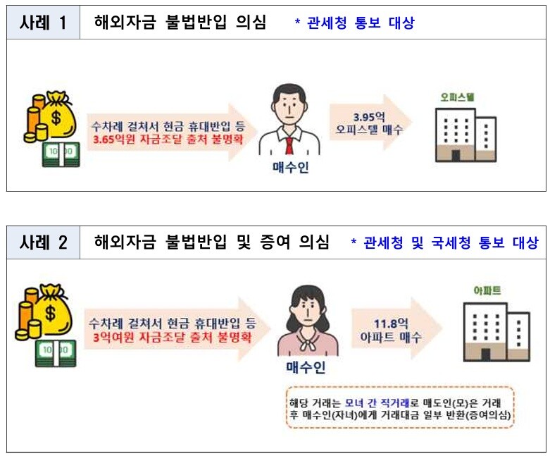한 외국인 매수인은 서울 소재 오피스텔을 매입하면서 매매대금 3억 9,500만 원 중 3억 6,500만 원을 해외송금과 현금 휴대반입으로 조달했으나, 외화 반입 신고가 없어 관세청 통보 대상이 됐다. 또 다른 사례에서는 모자가 직거래로 아파트를 매매하면서 자녀가 해외송금과 현금 반입으로 자금을 마련했고, 모가 거래대금 일부를 반환해 편법 증여가 의심돼 국세청에 통보됐다.