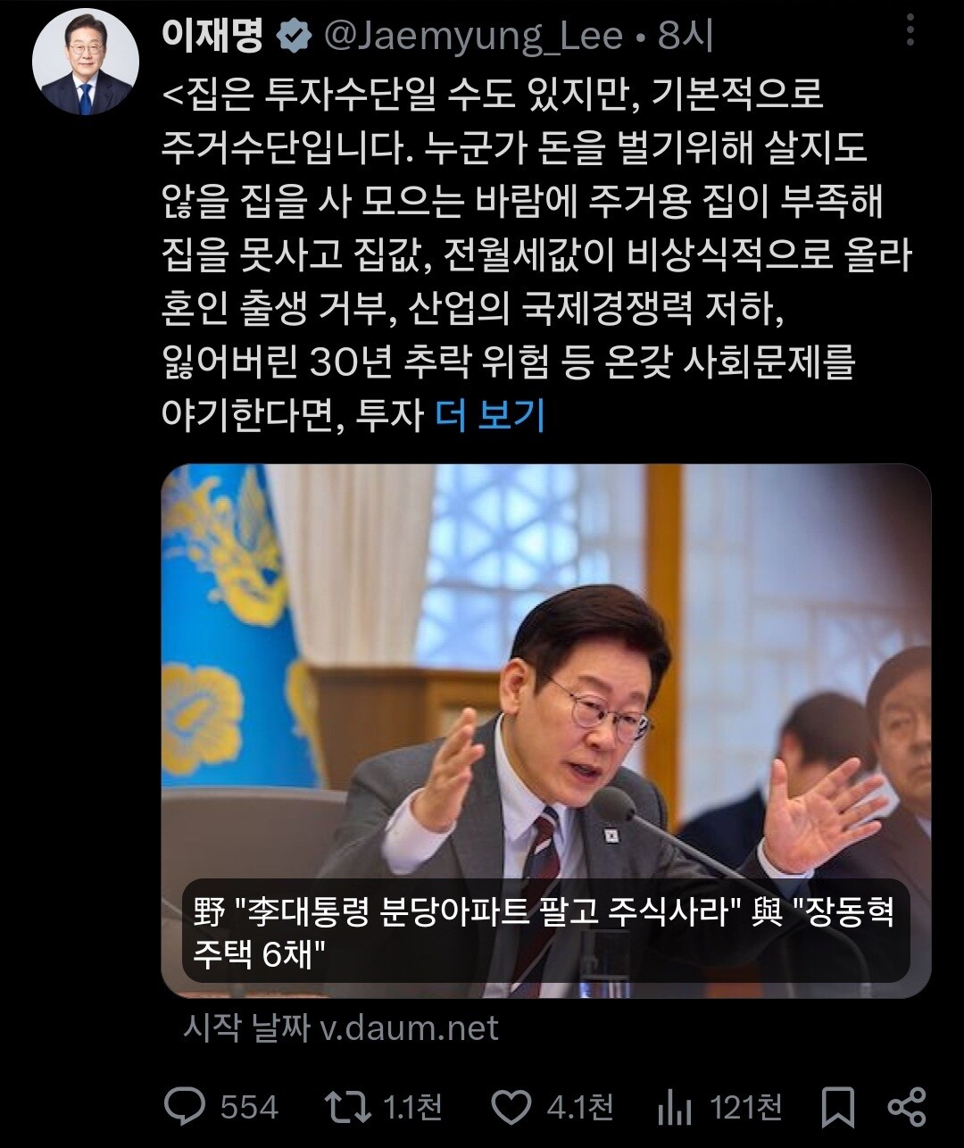 [도시경제채널 = 유덕부 기자] 이재명 대통령이 16일 오전 사회관계망서비스 엑스(X·옛 트위터)에 글을 올려 다주택 보유 문제를 정면으로 거론하며 국민의힘에 공개 질의했다. 대통령은 “집은 투자수단일 수도 있지만 기본적으로 주거수단”이라며 다주택 특혜 폐지와 규제 강화를 강조하고, 장동혁 대표를 향해 “국민의힘은 다주택자를 보호하고 특혜를 유지해야 한다고 보느냐”고 물었다.