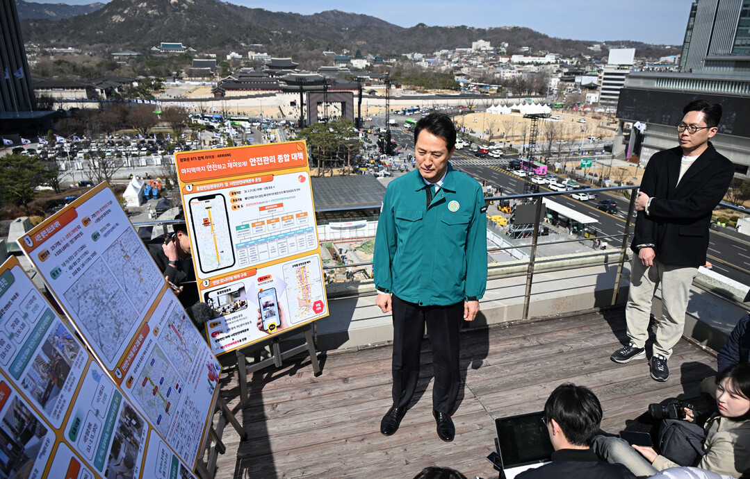 현장 점검에서 오 시장은 세종문화회관 옥상에 올라 공연장 전체를 조망하며 인파 밀집이 예상되는 병목 구간과 광화문역 출구, 안전 펜스 설치 현황 등을 집중적으로 점검했다.