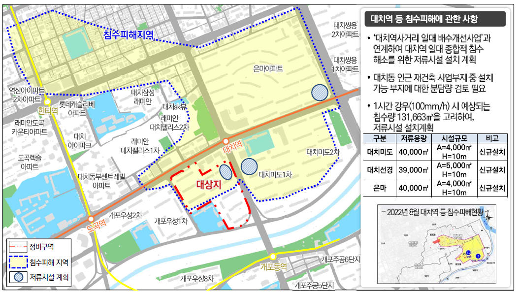 최근 재건축을 앞둔 강남구 대치역사거리 인근의 미도·은마·선경아파트는 지난해 정비사업과 연계한 ‘공공기여’ 방식으로 약 11만 9천 톤 규모 저류시설을 설치하는 방안을 마련했다. 이들 단지는 개발사업에서 발생한 이익으로 주거지 일대 침수를 막아줄 기반시설을 확충하고 사전에 재난 예방시설을 확보한 사례다.