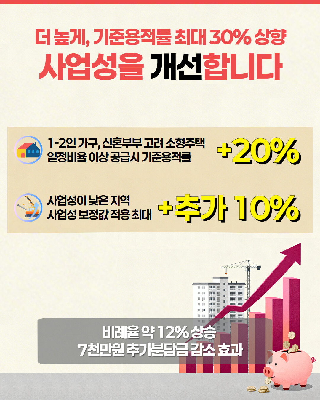 이번 개정으로 사업성 악화로 지연된 사업에 활력을 불어넣는다. 기준용적률을 최대 30% 상향하고, 소형주택을 일정 비율 이상 공급하면 추가 인센티브를 제공한다. 공시지가가 낮은 지역에는 보정값을 적용해 최대 10%까지 용적률을 더 올려주는 방식으로 사업성을 개선해 조합원 1인당 추가분담금이 약 7천만 원 줄어드는 효과가 기대된다.