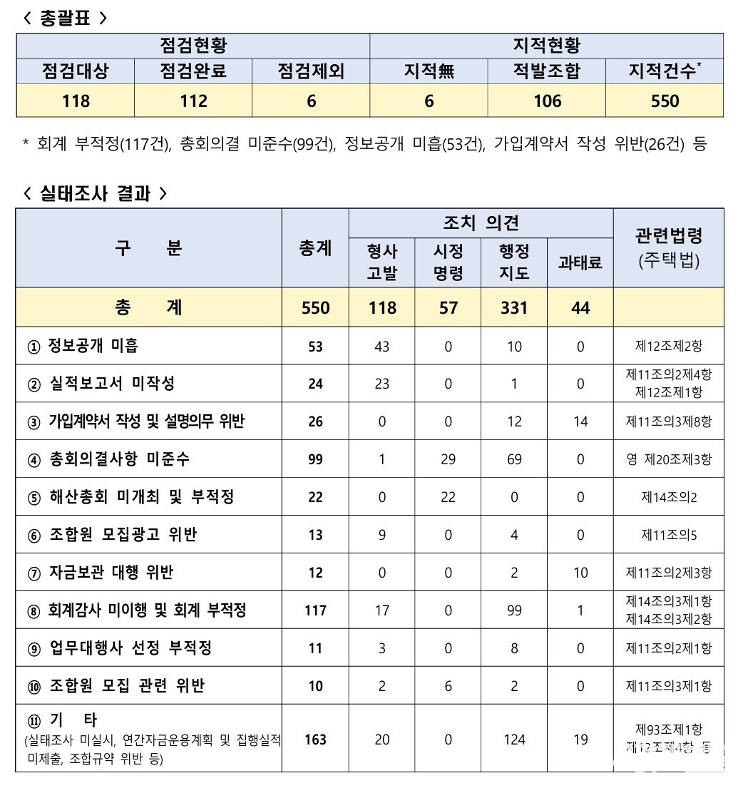 [도시경제채널 = 윤현중 기자] 서울 지역주택조합이 여전히 투명성과 운영 문제로 몸살을 앓고 있다. 서울시가 지난 7일 발표한 조사한 결과, 총 118개 조합 중 106곳을 점검한 결과 550건의 위반 사례가 적발됐다. 회계 부적정, 정보공개 미흡, 총회의결 위반, 자금보관 문제 등이 주요 적발 사안으로 드러났으며, 이 중 118건은 형사 고발로 이어졌다. 일부 조합은 연락 두절 상태거나 사업이 장기간 중단된 것으로 확인돼 조합원 피해가 심각한 수준이다.