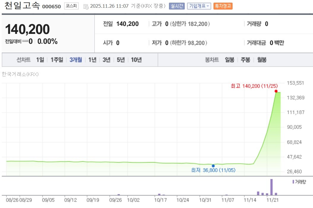 천일고속은 최근 일주일 사이 주가가 3배이상 상승하고 현재는 거래정지 상태다. /네이버 증권 화면 갈무리