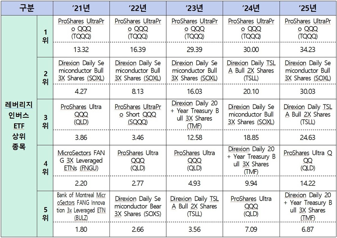 특히 반도체·나스닥 지수를 3배로 추종하는 고위험 레버리지 상품에 대한 투자 쏠림이 뚜렷해지면서, 수익 기대와 함께 손실 리스크도 커지고 있다는 우려가 나온다.