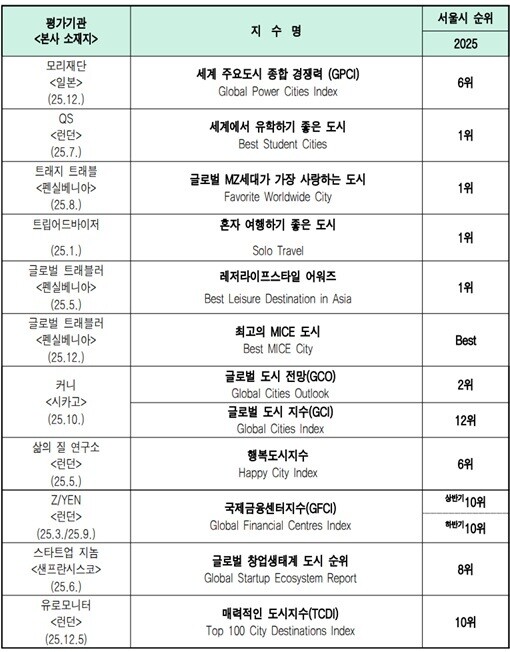 오세훈 서울시장은 “서울이 국제적 평가에서 잇따라 주목받으며 도시 역동성과 글로벌 관광 매력이 세계적으로 인정받고 있다”며 “앞으로 문화·관광 콘텐츠와 도시 인프라를 지속적으로 확충해 하드웨어와 소프트웨어를 두루 갖춘 ‘육각형 도시’로 발전시켜 나가겠다”고 밝혔다.
