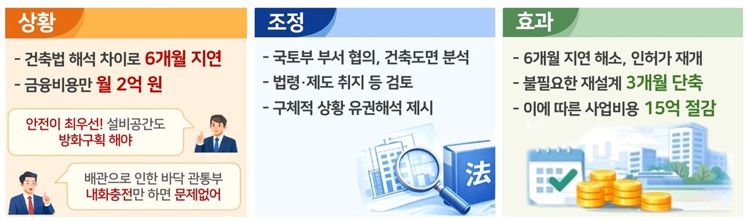 방화구획 적용 범위를 둘러싼 건축법 해석 차이로 사업승인이 6개월간 지연되며 매월 수억 원의 금융비용이 발생했다. 의정부시는 안전을 이유로 엘리베이터홀 설비배관공간까지 방화구획을 해야 한다고 주장했지만, 사업자는 바닥 관통 부분만 충전하면 법령에 적합하다고 해석했다. 지원센터는 도면과 법령을 검토해 사업자 해석이 타당하다는 유권해석을 제시했고, 불필요한 재설계와 비용 약 15억 원을 절감하며 인‧허가가 즉시 재개됐다.