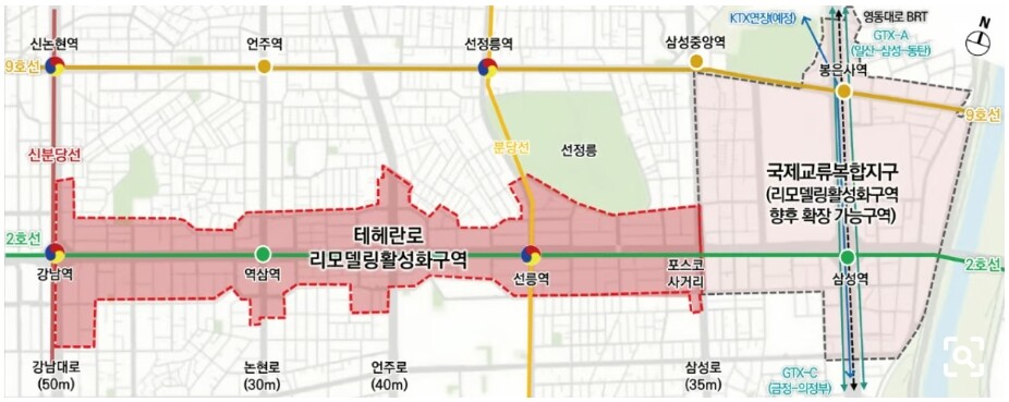 리모델링 활성화구역으로 지정된 구간은 강남역 사거리부터 포스코 사거리까지 약 95만㎡ 규모다. 준공 후 15년 이상 지난 노후 업무시설에 구조 안전성 강화, 수직 증축, 용적률 완화 등 인센티브를 적용해 리모델링이 단계적으로 추진된다.