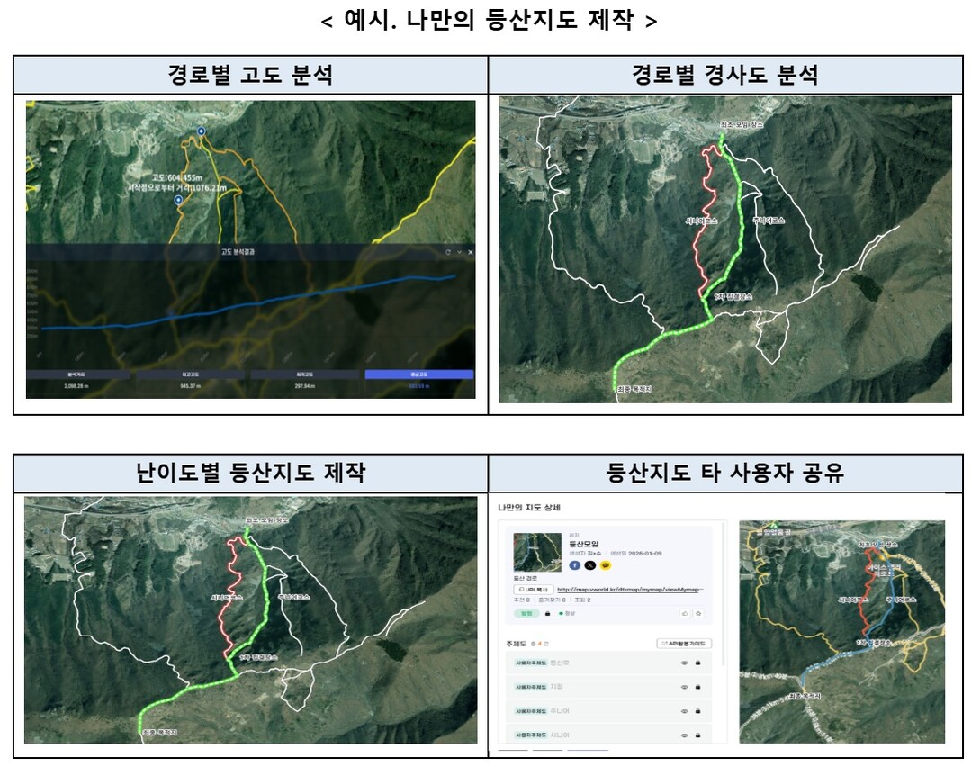 또한 ‘나만의 지도 제작’ 기능이 2D에서 3D로 확장됐다. 일반 국민 누구나 등산로, 자전거 도로, 건축 계획 등 원하는 정보를 적용해 입체지도를 제작하고 공유할 수 있다.