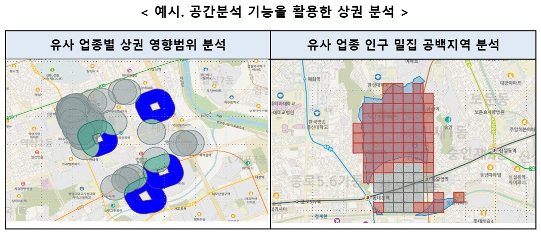 기존 4종에 불과했던 2D 분석 기능을 19종으로 확대해 인구 밀집도, 업종 근접도, 데이터 패턴 등을 종합적으로 분석할 수 있다. 이를 통해 병원, 학원, 카페 등 생활밀착 시설의 입지와 주변 인구 특성을 손쉽게 파악할 수 있어 소규모 창업자와 자영업자의 비용 부담을 줄이는 효과가 기대된다.