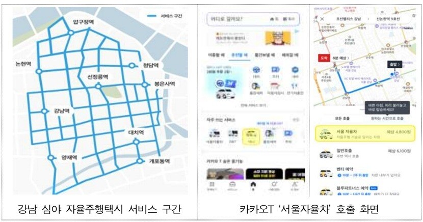 운행 시간은 평일 밤 10시부터 다음날 새벽 5시까지이며, 강남 자율주행 시범운행지구(약 20.4㎢) 내에서만 탑승 가능하다. 이용자는 ‘카카오T’ 앱을 통해 출발지와 목적지를 설정하고 ‘서울자율차’를 호출하면 된다.
