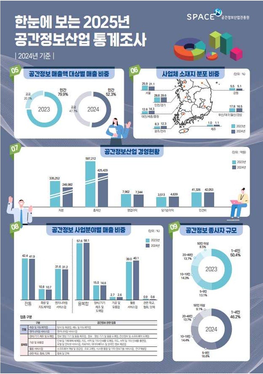 박정수 국토정보정책관은 “공간정보산업은 자율주행, 인공지능, 스마트시티 등 미래산업의 주춧돌”이라며 “신기술 개발과 전문인력 양성으로 산업 경쟁력을 강화하겠다”고 밝혔다. 그는 이어 “사업체 분포와 경영실태를 종합적으로 파악해 미래 전략 수립에 필요한 통계정보를 지속 제공할 것”이라고 덧붙였다.