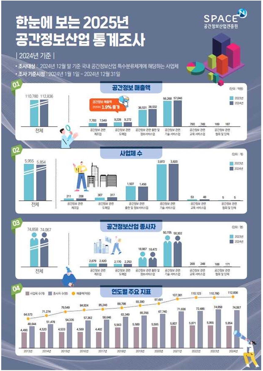 [도시경제채널 = 김학영 기자] 국토교통부는 21일 2024년 기준 공간정보산업 현황을 담은 ‘2025년 공간정보산업 통계조사’ 결과를 공개했다. 조사에 따르면 산업 매출액은 11조 2836억 원으로 전년 대비 2056억 원(1.9%) 증가했다.