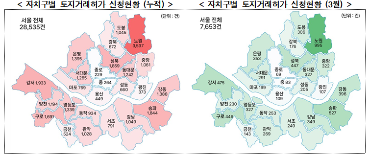 이는 지난해 10월 서울 전역 토지거래허가제 시행 이후 월별 기준 최대 신청량이다. 시는 오는 5월9일 다주택자 양도소득세 중과 유예 종료를 앞두고 해당 매물이 집중되면서 허가 신청이 증가한 것으로 파악했다.