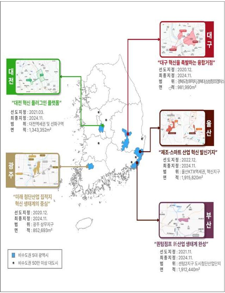 이번 종합발전계획은 기존 5개 광역시 도심융합특구에 대해 특구별 조성목표와 단계별 실행계획을 제시하는 한편, 인구 50만 이상 비수도권 대도시로 추가 지정할 수 있는 기준도 마련했다. 중앙정부는 기회발전특구, 연구개발특구, 글로벌혁신특구 등과 중첩 지정해 세제·규제 혜택을 강화하고, 중소벤처기업 지원, 특화산업 육성, R&D 지원 등 범부처 기업 지원 프로그램을 집중할 예정이다. 또한, 핵심사업에 대한 신속한 예비타당성조사와 용적률·건폐율 완화도 추진된다. 지방정부는 세제·부담금 감면, 공유지 장기임대 등을 통해 민간 참여를 촉진한다.