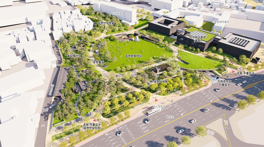 시는 송현문화공원에 대해 "주변 공간과의 보행 연계를 체계화해 공원이 도시 맥락 속에 자연스럽게 이어지도록 하고, 건축시설을 공원 외곽에 배치하면서 중심부를 비워 인왕산과 북악산을 조망하는 열린 경관을 구현했다"고 설명했다.