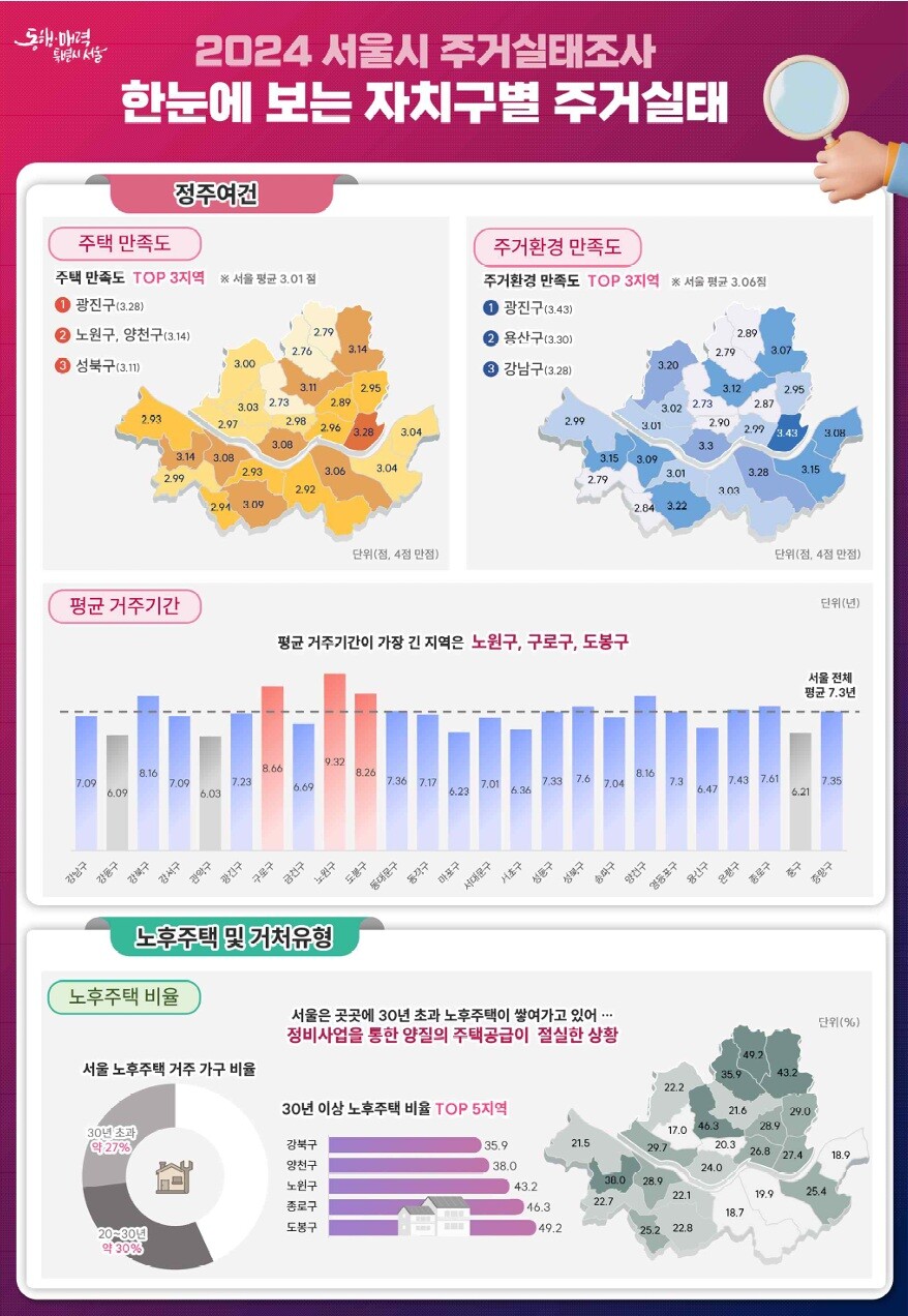 최진석 서울시 주택실장은 “최근 4년간 서울시민의 정주여건이 지속적으로 향상된 것으로 조사됐다”며 “표본 확대와 자체 문항 추가를 통해 지역별 정밀한 조사 기반을 마련한 만큼, 맞춤형 주거정책 수립에 적극 활용할 계획”이라고 밝혔다.