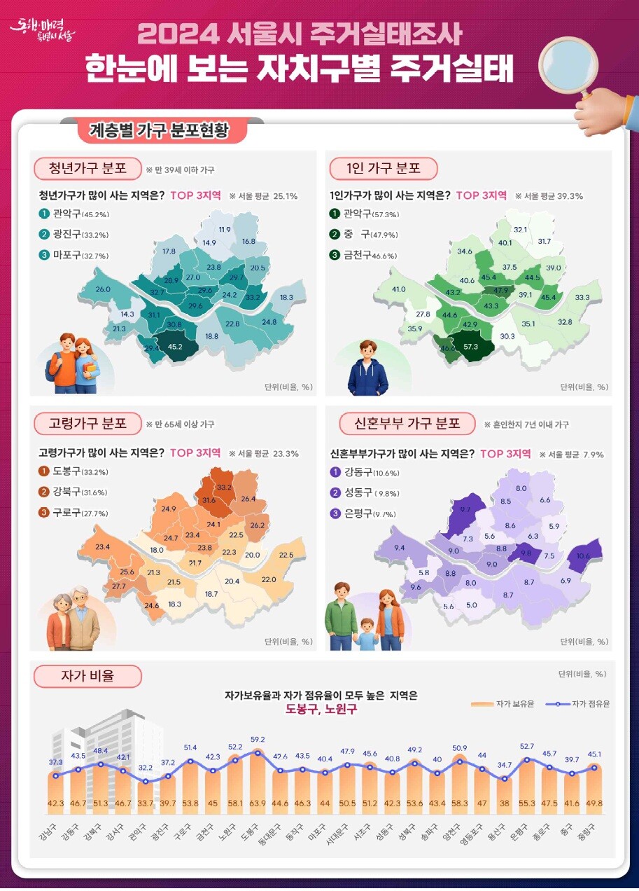반면, 청년 가구는 관악구와 광진구에 집중됐고, 신혼부부는 강동·성동, 고령 가구는 도봉구 등에서 높은 비중을 보였다.