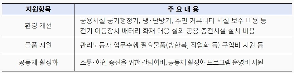 지원 항목은 단지별 자율 선택이 가능하며, 관리노동자 휴게실에 에어컨·공기청정기 설치, 경로당·주민소통공간 보수, 공동체 프로그램 운영 등이 포함된다. 서울시는 3월 중 심사위원회를 통해 지원 단지를 선정하고, 단지별 최대 3,000만 원까지 지원할 예정이다.