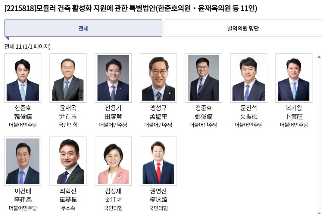 [도시경제채널 = 윤문용 기자] 정부가 강력히 추진해온 ‘모듈러 건축 활성화 지원에 관한 특별법’이 국회에서 여야 의원들의 공동발의로 속도를 내고 있다. 국토교통부는 지난해 12월 18일 국회에서 공청회를 개최한 데 이어, 같은 달 31일 한준호·윤재옥 의원 등 여야 의원 11인이 공동으로 법안을 발의하며 입법 절차를 본격화했다. 정부안보다 빠른 심사가 가능한 의원 입법 방식이 채택되면서, 법안 통과까지의 시간이 단축될 것으로 기대된다.
