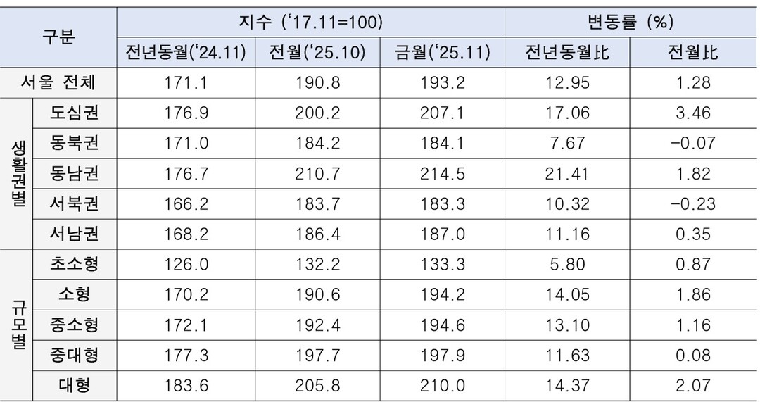 11월 서울 아파트 매매 실거래가는 전월 대비 1.28% 상승했으며, 2021년 10월 고점 대비 1.3% 상회했다. 도심권은 전월 대비 3.46% 상승해 전체 지수 상승을 견인했고, 대형 아파트가 2.07% 오르며 가장 두드러진 상승세를 보였다.