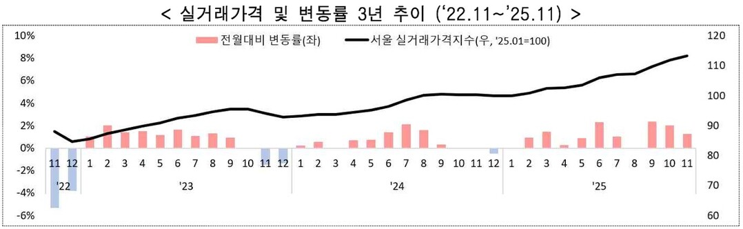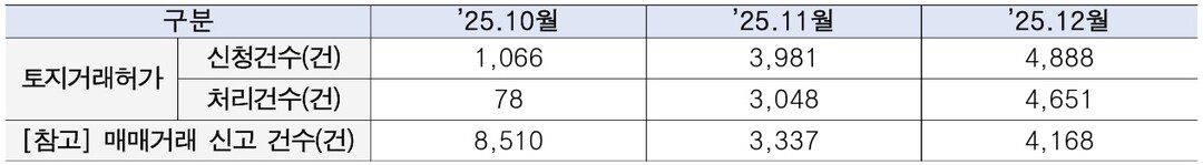 서울 전역에서 토지거래허가제가 시행된 이후 12월 말 기준 아파트 토지거래허가 신청은 총 9,935건에 달했다. 이 중 7,777건(78.3%)이 처리됐으며, 10월~11월 신청가격은 10월 실거래가 대비 1.49% 상승했고, 12월 신청가격은 전월 대비 1.58% 오르는 등 상승세가 확대됐다. 이는 제도 시행 이후 거래가 위축되기보다는 가격 흐름이 꾸준히 이어지고 있음을 보여준다.