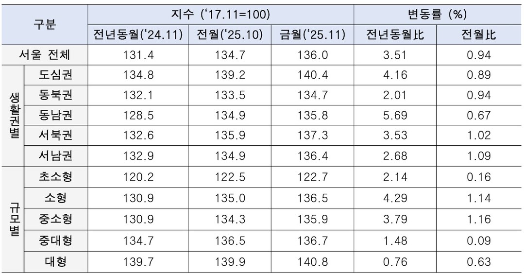 11월 서울 아파트 전세 실거래가는 전체 기준 0.94% 올랐으며, 서남권이 1.09%로 가장 높은 상승률을 기록했다. 규모별로는 중소형(60~85㎡)이 1.16% 상승해 가장 뚜렷한 오름세를 보였다. 이는 실거래 기반 지수가 시장 체감도를 충실히 반영하고 있음을 보여준다.