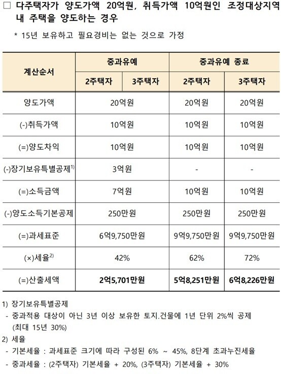 예를 들어, 20억 원에 주택을 양도하고 10억 원에 취득한 경우, 중과유예 기간에는 장기보유특별공제를 적용해 세액이 2억5천만 원 수준이지만, 유예 종료 후에는 공제가 배제돼 2주택자는 약 5억8천만 원, 3주택자는 약 6억8천만 원으로 세 부담이 크게 늘어난다.