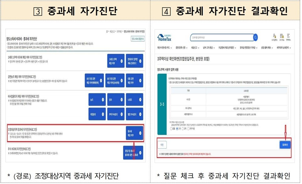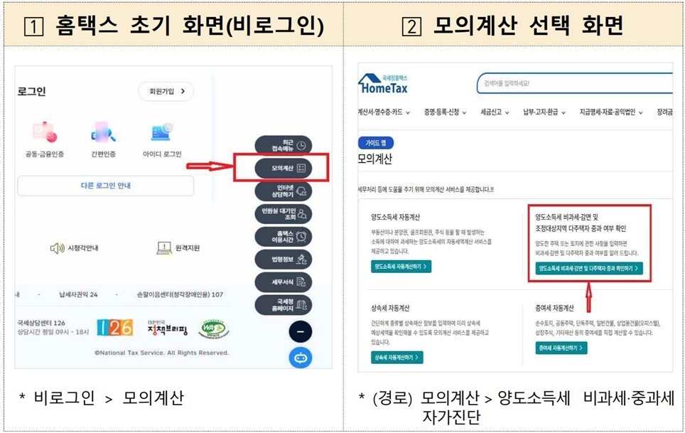납세자는 홈택스와 손택스를 통해 ‘양도소득세 중과 자가진단’ 서비스를 이용해 중과 여부를 확인할 수 있다. 또한 ‘양도소득세 모의계산’ 기능을 통해 예상 세액을 미리 계산할 수 있어 신고 준비에 도움을 받을 수 있다. 국세청 누리집에는 세액계산 흐름도와 신고·납부 안내 자료도 게시돼 있다.