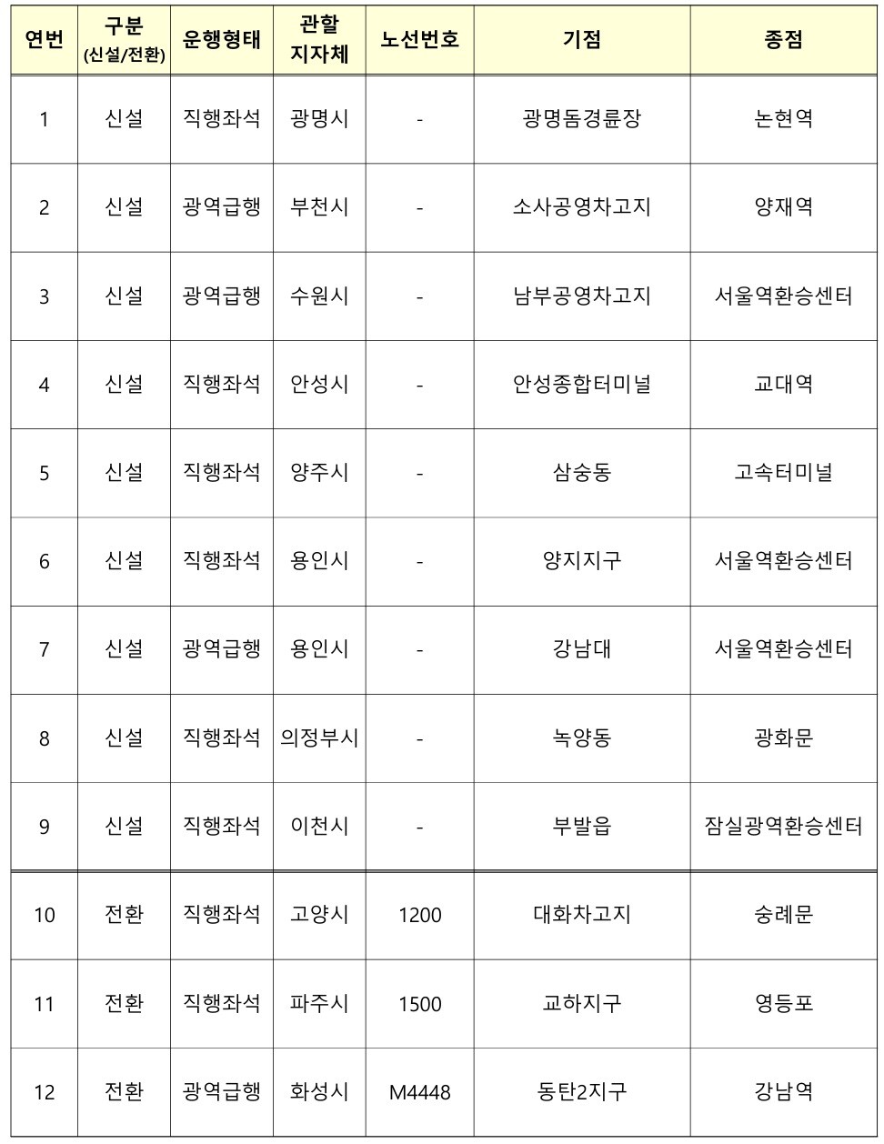 신규 노선은 논현역, 양재역, 서울역, 교대역, 고속터미널, 광화문 등으로 연결되며, 운송사업자 선정과 면허 발급, 차량 확보 절차를 거쳐 내년 중 운행을 시작할 예정이다. 전환 노선 중 고양(1200번)과 화성(M4448번)은 오는 27일부터 준공영제로 운행을 개시하고, 파주(1500번)는 내년 상반기 운행을 목표로 하고 있다.